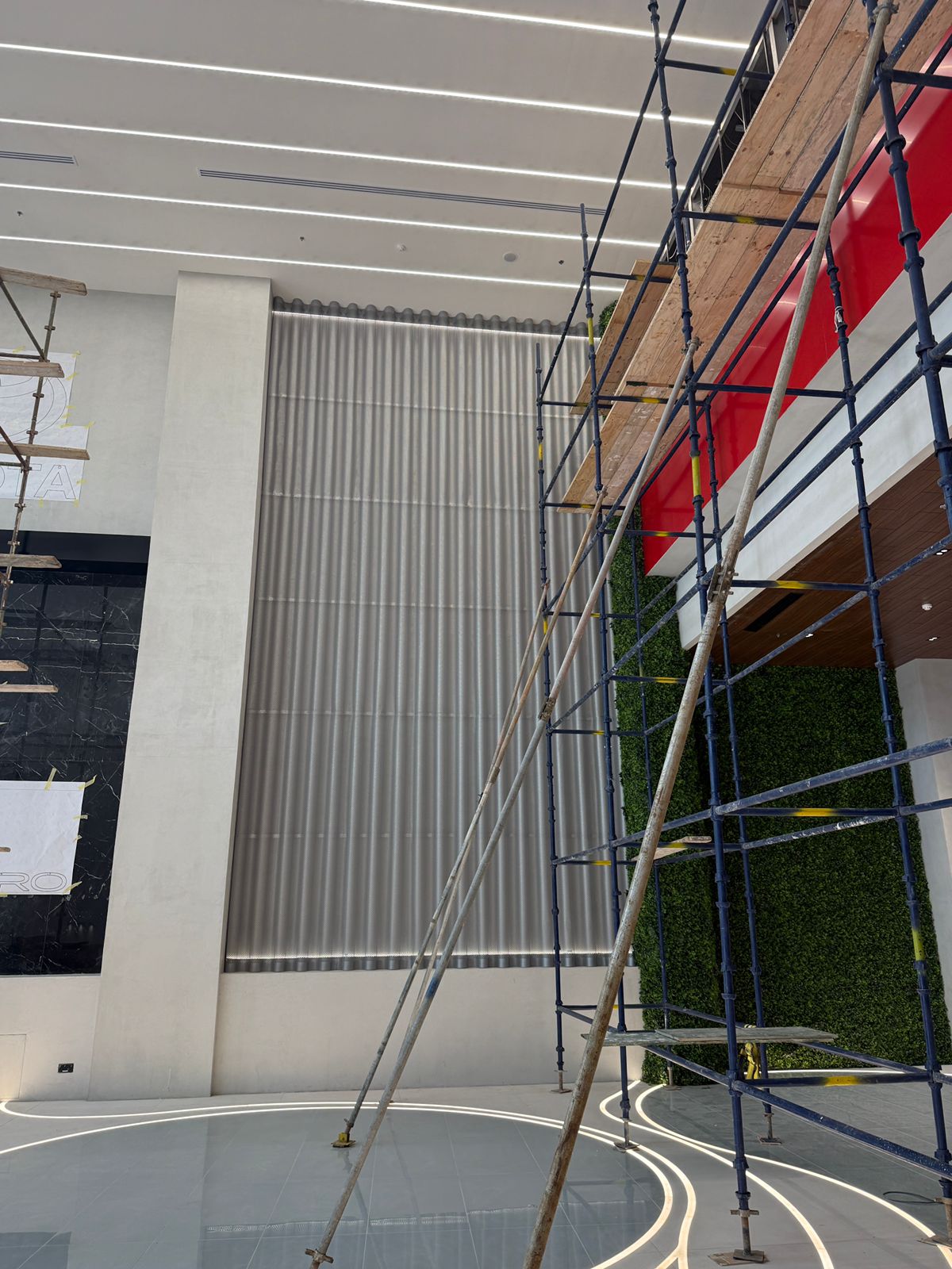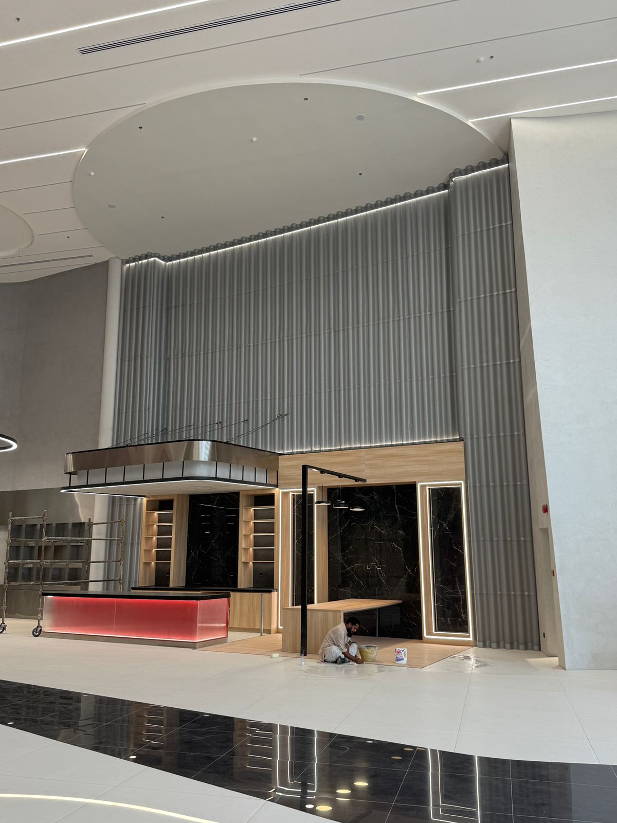 ج 1: يكسر التصميم المتموج للوحة الزخرفية المصنوعة من الألومنيوم المثقوبة المتموجة لصالة عرض تويوتا في دبي رتابة الممر التقليدي. حيث تخلق خطوطه الانسيابية تأثيراً بصرياً ديناميكياً يضفي إحساساً بالحركة والإيقاع. ويعكس الشكل المتموج الضوء بطرق فريدة من نوعها، مما ينتج عنه أنماط ضوء وظلال مثيرة للاهتمام تجعل الممر أكثر جاذبية وفنية.